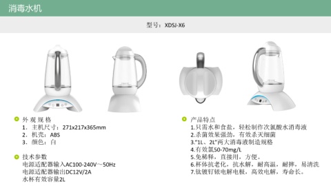 消毒水机 型号:XDSJ-X6 外 观 规 格 产品特点 1.主机尺寸:271x217x365mm 1.只需水和食盐,轻松制作次氯酸水消毒液 2.机壳:ABS 2.杀菌效果强劲,有效杀灭细菌 3.颜色:白 3.“1L、2L”两大消毒液制造规格 4.有效氯50-70mg/L 技术参数 5.免稀释,直接用,方便。 电源适配器输入AC100-240V~50Hz 6.杯体抗老化,抗水解,耐高温,耐摔,易清洗 电源适配器输出DC12V/2A 7.钛镀钌铱电解电极,高效电解,寿命长。 水杯有效容量2L