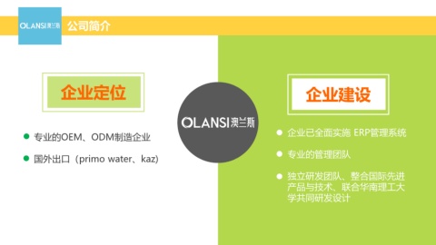 公司简介 企业定位 企业建设 专业的OEM、ODM制造企业 企业已全面实施 ERP管理系统 国外出口(primo water、kaz) 专业的管理团队 独立研发团队、整合国际先进 产品与技术、联合华南理工大 学共同研发设计