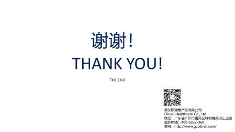 谢谢! THANK YOU! THE END 澳兰斯健康产业有限公司 Olansi Healthcare Co., Ltd. 地址:广东省广州市番禺区钟村镇高沙工业区 服务热线:400-8822-360 官网:http://www.gzolansi.com/