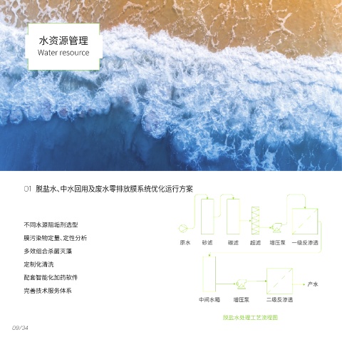 水资源管理 Water resource 01 脱盐水、中水回用及废水零排放膜系统优化运行方案 不同水源阻垢剂选型 膜污染物定量、定性分析 多效组合杀菌灭藻 定制化清洗 配套智能化加药软件 完善技术服务体系 脱盐水处理工艺流程图 09/34