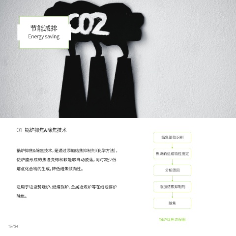 节能减排 Energy saving 01 锅炉抑焦&除焦技术 锅炉抑焦&除焦技术,是通过添加结焦抑制剂(化学方法), 使炉膛形成的焦渣变得松软能够自动脱落,同时减少低 熔点化合物的生成,降低结焦倾向性。 适用于垃圾焚烧炉、燃煤锅炉、金属冶炼炉等在线或停炉 除焦。 锅炉除焦流程图 15/34
