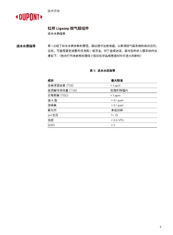 进水水质指导 表 1 总结了给水水质参数的限值。建议遵守这些限值,以确保脱气膜系统的成功运行。