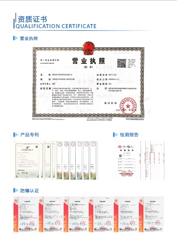 资质证书 QUALIFICATION CERTIFICATE 营业执照 产品专利 检测报告 防爆认证