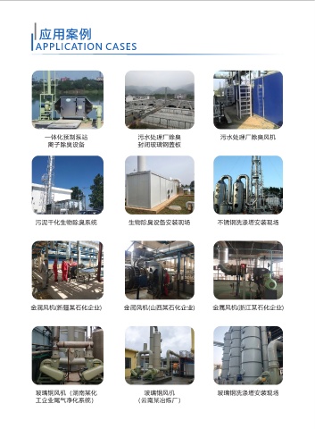 应用案例 APPLICATION CASES 一体化预制泵站 污水处理厂除臭 污水处理厂除臭风机 离子除臭设备 封闭玻璃钢盖板 污泥干化生物除臭系统 生物除臭设备安装现场 不锈钢洗涤塔安装现场 金属风机(新疆某石化企业) 金属风机(山西某石化企业) 金属风机(浙江某石化企业) 玻璃钢风机(湖南某化 玻璃钢风机 玻璃钢洗涤塔安装现场 工企业尾气净化系统) (云南某冶炼厂)