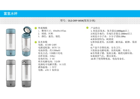 外观规格 1.整体尺寸:69x69x197mm 2.材质:PC料 3.颜色:蓝色、银色 技术参数 电源:AC100-240V 电源适配器:DC5V/1A 电池容量:约1200mAH 充电方式:USB插口充电 水杯容量:350ml 充电时间:3-4H 单次电解电间:5分钟 充满电可电解次数:≧15次 液体温度:1-55℃ 电极:ø30.5 钛铂金