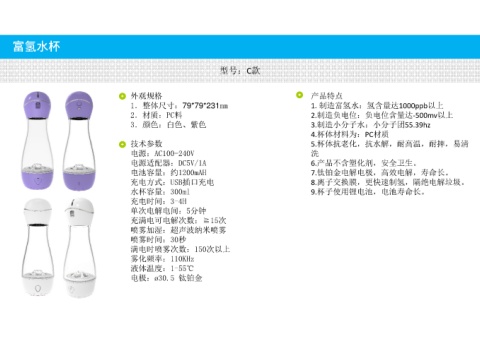 外观规格 1.整体尺寸:79*79*231mm 2.材质:PC料 3.颜色:白色、紫色 技术参数 电源:AC100-240V 电源适配器:DC5V/1A 电池容量:约1200mAH 充电方式:USB插口充电 水杯容量:300ml 充电时间:3-4H 单次电解电间:5分钟 充满电可电解次数:≧15次 喷雾加湿:超声波纳米喷雾 喷雾时间:30秒 满电时喷雾次数:150次以上 雾化频率:110KHz 液体温度:1-55℃ 电极:ø30.5 钛铂金