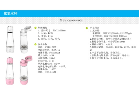 产品特点 1.氢浓度: 电解1次,浓度可达到800ppb到1200ppb 多次电解,浓度可达1000-1500ppb 2.制造负电位:负电位含量达‐200mv以上 3.制造小分子水:小分子团55.39hz 4.杯体材料为:PC材质 5.杯体抗老化,抗水解,耐高温,耐摔,易清 洗 6.产品不含塑化剂,安全卫生。 7.钛铂金电解电极,高效电解,寿命长。 8.杯子使用锂电池,电池寿命长。