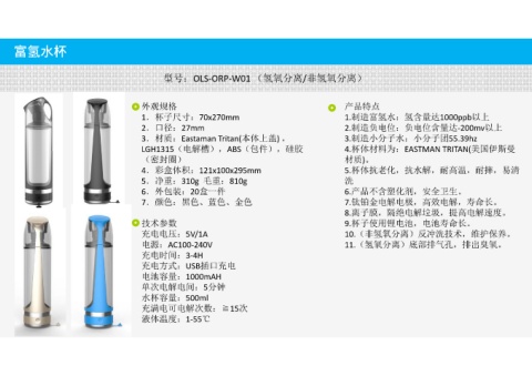 1.杯子尺寸:70x270mm 3.材质:Eastaman Tritan(本体上盖) , LGH1315(电解槽),ABS(包件),硅胶 4.彩盒体积:121x100x295mm 5.净重:310g 毛重:810g 6.外包装:20盒一件 7.颜色:黑色、蓝色、金色 充电电压:5V/1A 电源:AC100‐240V 充电方式:USB插口充电 电池容量:1000mAH 单次电解电间:5分钟 水杯容量:500ml 充满电可电解次数:≧15次