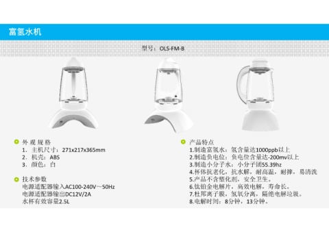产品特点 1.制造富氢水:氢含量达1000ppb以上 2.制造负电位:负电位含量达‐200mv以上 3.制造小分子水:小分子团55.39hz 4.杯体抗老化,抗水解,耐高温,耐摔,易清洗 5.产品不含塑化剂,安全卫生。 6.钛铂金电解片,高效电解,寿命长。 7.杜邦离子膜,氢氧分离,隔绝电解垃圾。 8.电解时间:8分钟,13分钟。