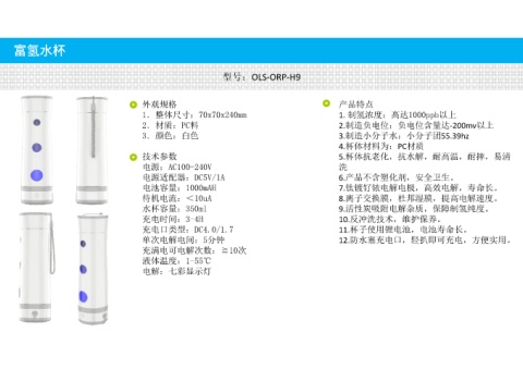 4.杯体材料为:PC材质 3.制造小分子水:小分子团55.39hz 5.杯体抗老化,抗水解,耐高温,耐摔,易清 6.产品不含塑化剂,安全卫生。 7.钛镀钌铱电解电极,高效电解,寿命长。 8.离子交换膜,杜邦湿膜,提高电解速度。 9.活性炭吸附电解杂质,保障制氢纯度。 10.反冲洗技术,维护保养。 11.杯子使用锂电池,电池寿命长。 12.防水塞充电口,轻扒即可充电,方便实用。