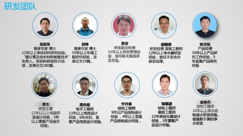 12年以上净化材料研究经验。 10年以上环境工 15年以上研发管理经 12年以上净水器研发 10年以上产品研