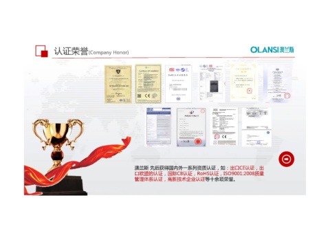 口欧盟的认证,国际CB认证,RoHS认证,ISO9001:2008质量 澳兰斯先后获得国内外一系列资质认证,如:出口CE认证,出 管理体系认证,高新技术企业认证等十余项荣誉。 认证荣誉(CompanyHonor)
