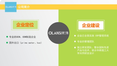 公司简介 企业定位 企业建设 企业已全面实施 ERP管理系统 专业的OEM、ODM制造企业 专业的管理团队 国外出口(primo water、kaz) 独立研发团队、整合国际先进 产品与技术、联合华南理工大 学共同研发设计