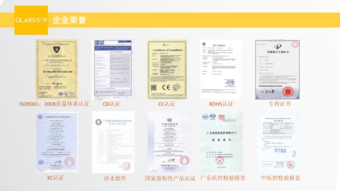 企业荣誉 ISO9001:2008质量体系认证 CB认证 CE认证 ROHS认证 专利证书 3C认证 涉水批件 国家强制性产品认证 广东疾控检验报告 中疾控检验报告