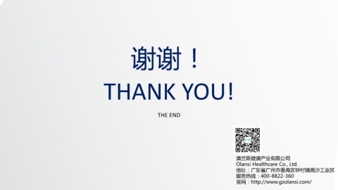谢谢! THANK YOU! THE END 澳兰斯健康产业有限公司 Olansi Healthcare Co., Ltd. 地址:广东省广州市番禺区钟村镇高沙工业区 服务热线:400-8822-360 官网:http://www.gzolansi.com/