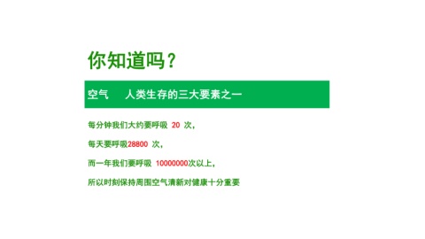 你知道吗? 空气 人类生存的三大要素之一 每分钟我们大约要呼吸 20 次, 每天要呼吸28800 次, 而一年我们要呼吸 10000000次以上, 所以时刻保持周围空气清新对健康十分重要