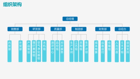 组织架构 总经理 销售部 研发部 质量部 制造部 财务部 总经办 内 外 产 理 空 水 测 品 对 生 工 采 生 成 应 仓 人 E 项 贸 贸 品 疗 气 机 评 控 外 产 艺 购 产 本 收 储 力 R 目 部 部 策 美 净 组 中 组 服 车 组 组 计 核 应 组 行 P 支 划 容 化 心 务 间 划 算 付 政 组 持 组 器 组