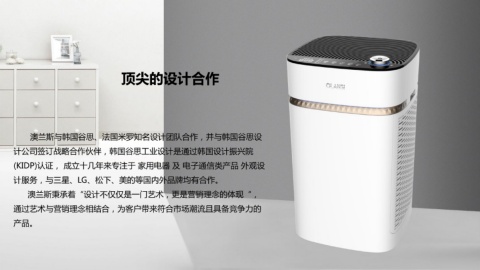 顶尖的设计合作 澳兰斯与韩国谷思、法国米罗知名设计团队合作,并与韩国谷思设 计公司签订战略合作伙伴,韩国谷思工业设计是通过韩国设计振兴院 (KIDP)认证, 成立十几年来专注于 家用电器 及 电子通信类产品 外观设 计服务,与三星、LG、松下、美的等国内外品牌均有合作。 澳兰斯秉承着“设计不仅仅是一门艺术,更是营销理念的体现“, 通过艺术与营销理念相结合,为客户带来符合市场潮流且具备竞争力的 产品。