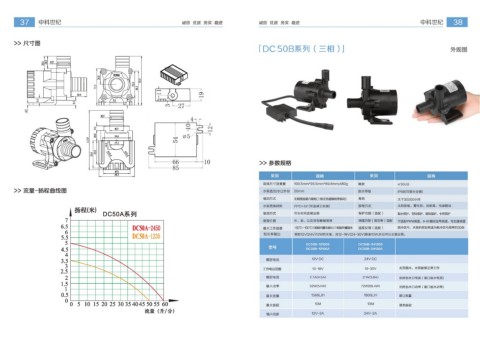 i 扬程( 米 ) DC50A 系 列 使用 方式 可 长 间时 连 续 运转 保护 功能 ( 选 配 ) 缺 水保护 、 空转保护 、堵转保护 、 卡 死保护